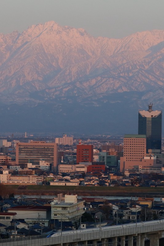 久しぶりの快晴に、魚津市の上中島地区で北陸自動車道の手前から、僧ヶ岳を背景に松倉高架橋を走るW7系を撮る。その後、呉羽山へ行ってみる。