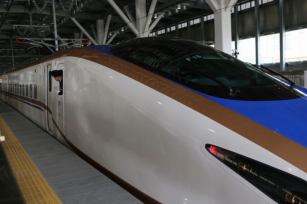 3月16日(月)、富山駅でホームへ入場し、ピカピカの新幹線車両を目の前で見てくる。新幹線が入ってくると先頭車両を撮影するため、カメラや携帯電話を持った人がホームの端に集まってくる。 |