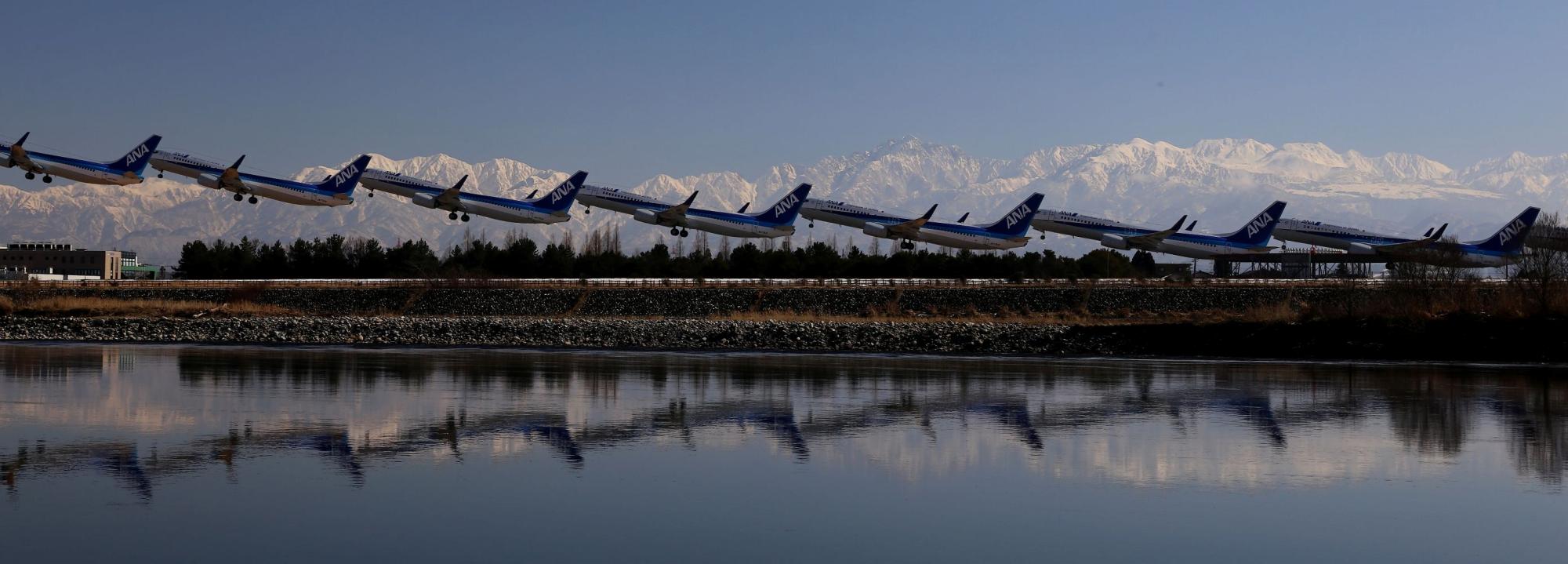 丂恄捠愳偺壐傗偐側悈柺偵丄棧棨偡傞 B737偺婡塭偲梉擔傪庴偗彮偟愒傒偑偐偭偨
