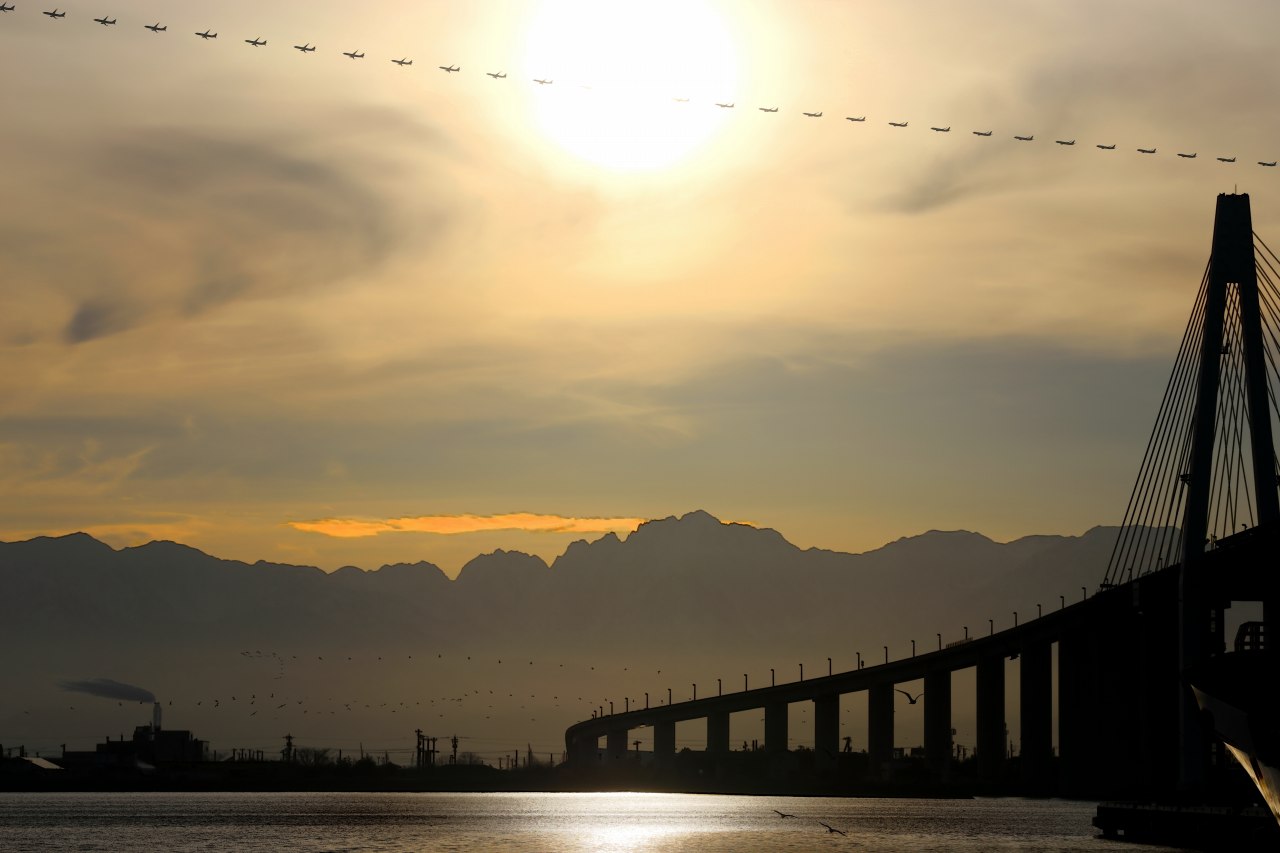 太陽がが昇につれ、海面に映る新湊大橋の影がはっきりと見えてきた。