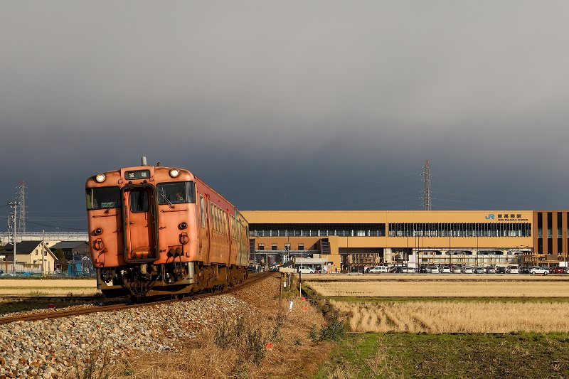 | JR氷見線は、城下町高岡から富山湾に向かい、海の幸豊富な氷見へと走る路線距離16.5km、8駅のローカル線です。高岡駅を出て左にカーブし住宅街が続く。このエリアには前田利長が築いた高岡城の跡地として整備された高岡古城公園や、市役所・美術館・高等学校など、高岡の主要施設がある。国道8号線の高架をくぐり住宅街を過ぎると、伏木までは工場地帯を走る。越中国分駅でて雨晴トンネルを抜けると富山湾に出と、車窓からは富山湾越しに広がる雄大な立山連峰を見ることが出来る。 |