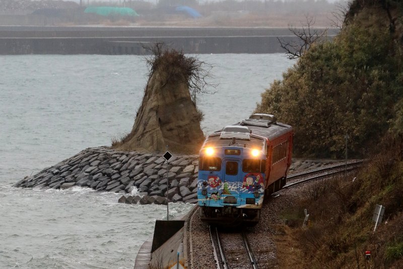 雨晴海岸を走る「忍者ハットリくん」列車。