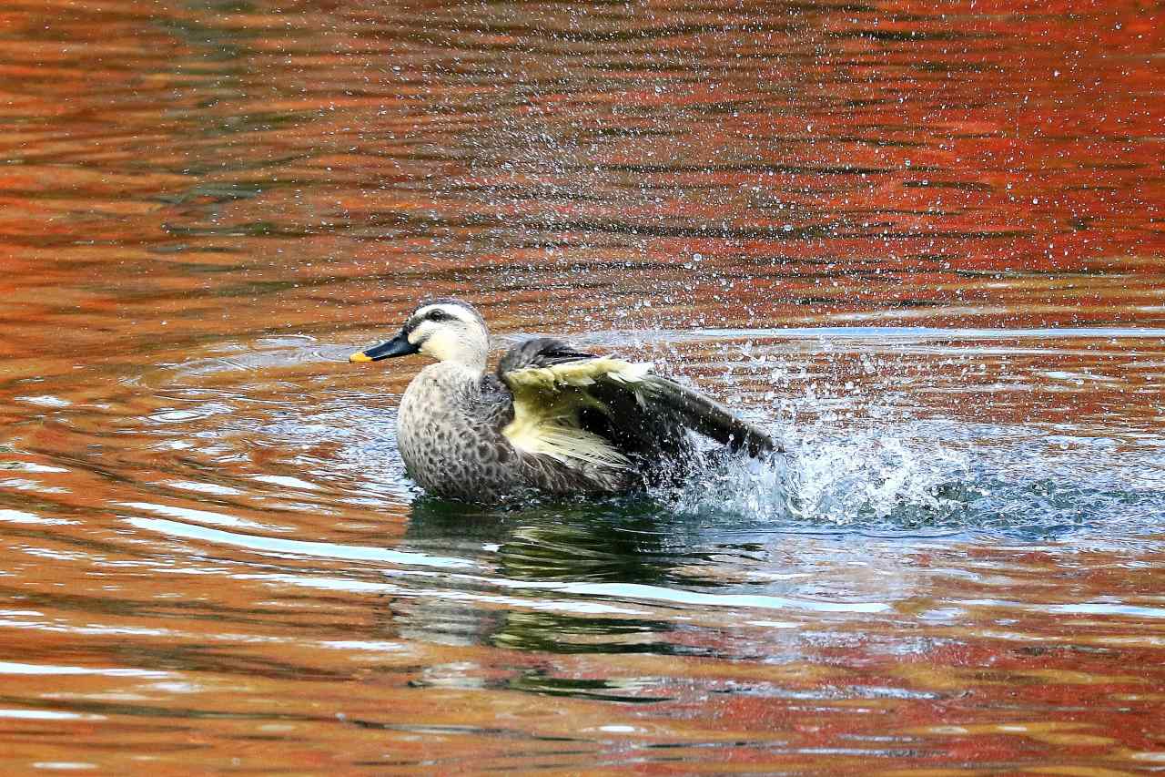 紅葉を映したお堀には、カルガモの泳ぐ姿を見ることも出来る。 |