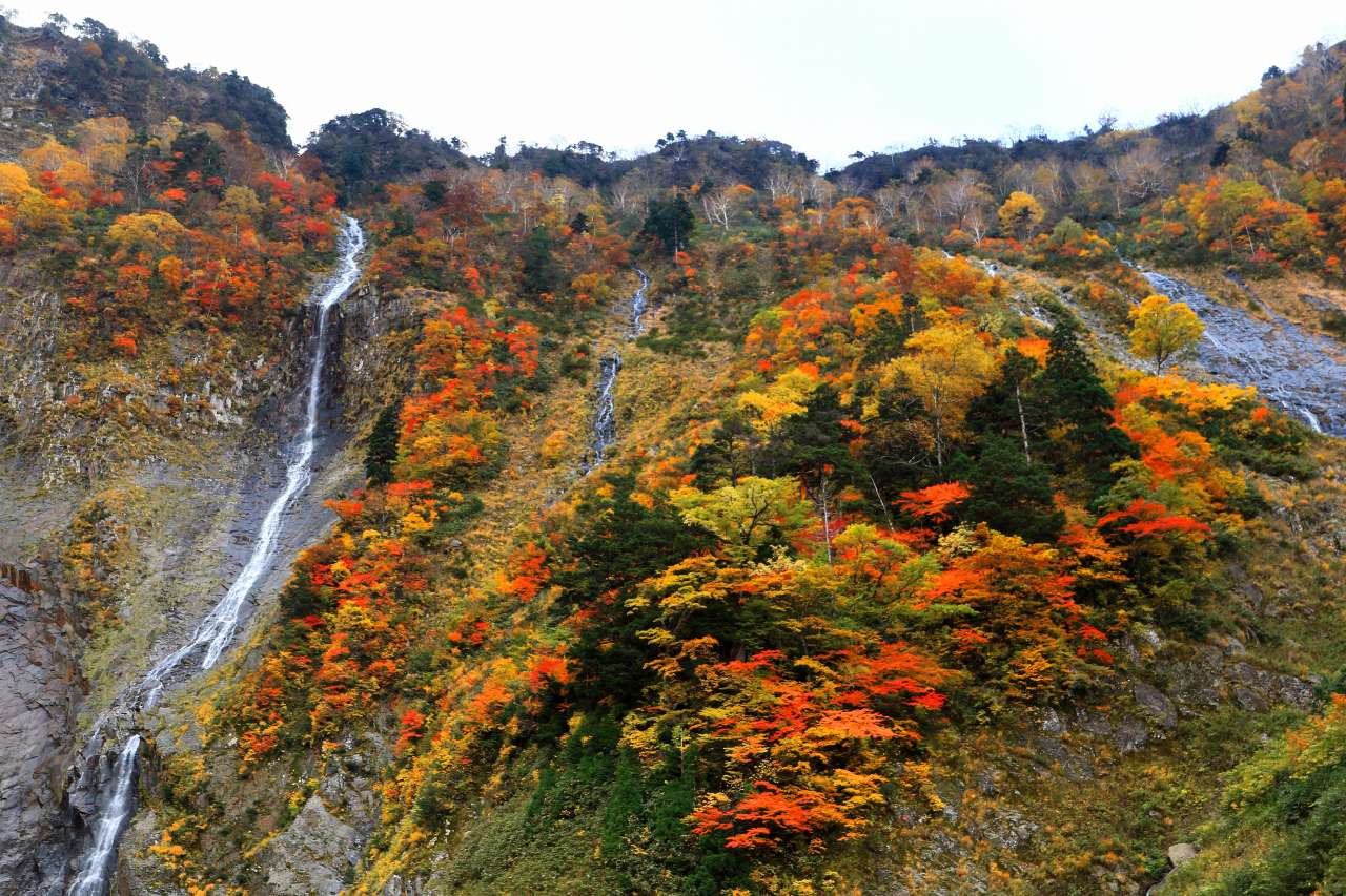 日本一の落差350mを誇る称名滝は国の名勝・天然記念物になっている。称名滝から続く渓谷は、10月下旬ごろにはきれいに色づいたブナやナナカマドで美しい風景を見せてくれる。 |