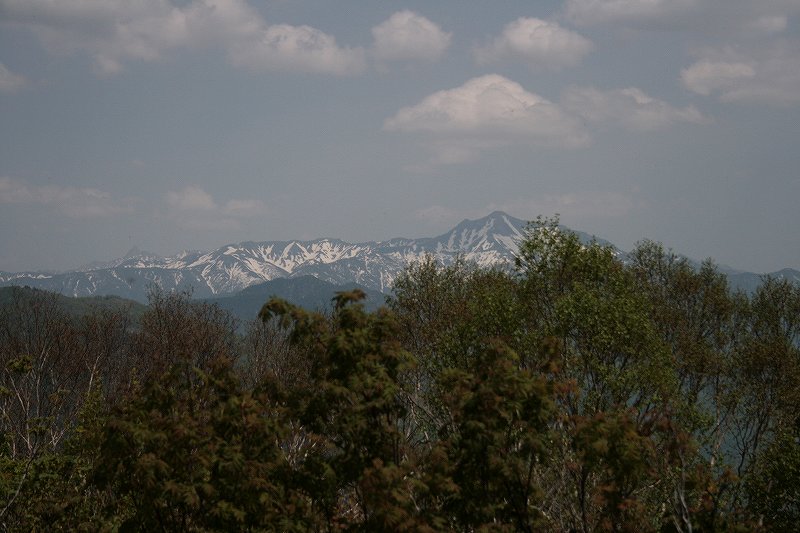 キャンプ場内を進み、水事場の横から登山道に入る。沢に沿って作られた登山道は徐々に斜度を増し、沢から外れると急登が始まる。30分ほどで急登を登りきると(12:15)視界が開けたスズメ平に着き、振り返ると雪の残る立山連峰から黒部五郎岳を観る事が出来た。