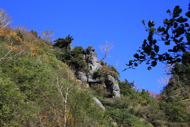 獅子ヶ鼻岩の真下までは、一ノ谷の斜面をクサリ伝いに進む。
