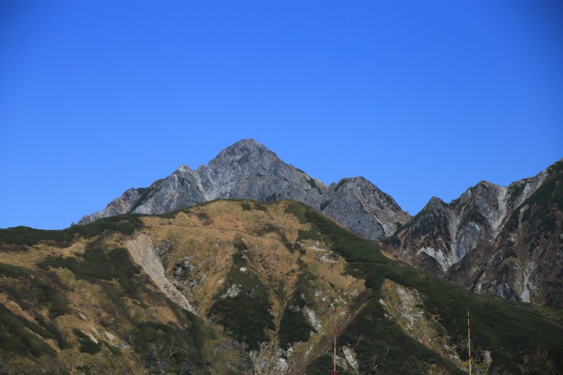 散策コースから見る大日岳や天狗山の斜面の紅葉は、一昨日の台風の強風で葉が落ち色あせてしまっていた。