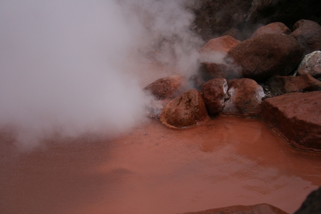 | 九州横断道路(やまなみハイウェイ)の入口から湯布院への途中、「海地獄」に立寄り、温泉たまご(5個300円)で腹ごしらえする。 |