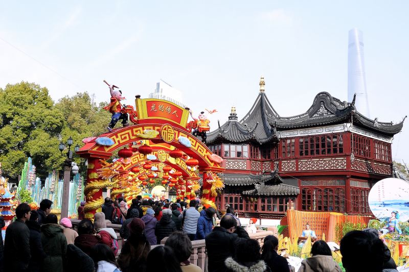 豫園商城の入口から少し離れた公園脇でバスを降り、人民路から細い脇道に入る。道沿いには雑貨や正月飾りを売る店が立ち並び、電動バイクが邪魔だとばかりに警笛を鳴らし通り過ぎて行く。豫園商城の入口の上には正月飾りなのだろうか?五輪の輪に「健康」の文字が飾られている。通りを進むと提灯などの飾り付けが目を引く。集合写真を撮った後、食堂の3Fに上がり飲茶料理の昼食。ここでも紹興酒とビールの小宴会が始まる。昼食の後40分ほどの自由散策、中国の正月に向けた飾り付けがされた商店街やお寺の前の広場を見て回り、上海の伝統文化に触れたように思われた。