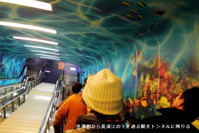 「19:00」 OPツアーの外灘夜景観賞に向かう。夜の上海のビル群は色とりどりにライトアップされ、日中の霞がかった白さを感じさせない。外灘側から黄浦江の下を通る観光トンネルを、カートに乗って対岸の金融貿易の中心区に渡る。そこには超高層ビルが立ち並び、見上げると首が痛くなる。世界第2位、高さ632mを誇る高層ビル「上海中心大厦」。その118F展望台から上海の夜景を見るため、高速エレベーター(三菱電機製)に乗る。エレベーターは秒速18m、約55秒で118階、高さ546mの展望フロアに到着する。